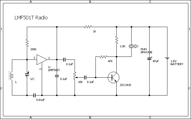 専用ICは、ミツミのLMF501Tというラジオ用の小型ICで、見た目はトランジスタと同じです。単3電池1本の電圧が定格となっています。このICは高周波増幅と検波を内蔵しているので、低周波増幅にトランジスタを追加して作成しました。